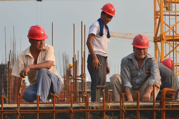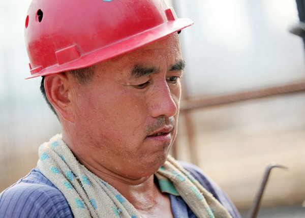 采訪時正值下午三點半,室外溫度達到35℃,再加上地面被太陽炙烤了幾個小時,直逼上來的熱氣讓人有點吃不消。筆者在工地的陰涼處呆了不到5分鐘,從頭到腳已出了不少汗。市房管局中遠公司涵翠苑項目部技術員陳生文告訴筆者,“項目部為工人們制訂了防暑降溫的辦法,充足供應綠豆水,正午太陽很毒的時候休息會,下涼后再干。”陳生文說完,接個工友的電話就又忙著干活去了。