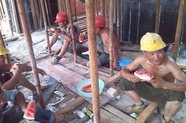 立秋以來,“秋老虎”繼續(xù)發(fā)威,氣溫持續(xù)升高,工地施工依然處于艱難的高溫作業(yè)期。日前,公司領(lǐng)導(dǎo)班子成員帶隊(duì)深入工地一線“送清涼”,確保工人在高溫下的安全。 在涵翠苑施工現(xiàn)場(chǎng),鋼管曝曬后溫度高達(dá)60℃,工人不戴手套就無法握拿;清理地下室材料時(shí),雖有鼓風(fēng)機(jī)降溫,但工人們熱得只穿短褲;綁扎樓面筋的鋼筋工是最挨曬的,大家想出一招——把布浸濕披在身上,以達(dá)到防暑降溫效果。在“秋老虎”肆虐之際,公司黨支部書記杜洋堅(jiān)帶領(lǐng)中層干部為工人們送上了清涼飲品、西瓜等慰問品,對(duì)在高溫天氣下仍在露天作業(yè)的施工班組人員和施工管理人員表示誠(chéng)摯地慰問,囑咐工人們注意身體,并要求項(xiàng)目部合理安排施工時(shí)間和施工節(jié)奏,保證施工進(jìn)度和人員安全。 (王月明) |