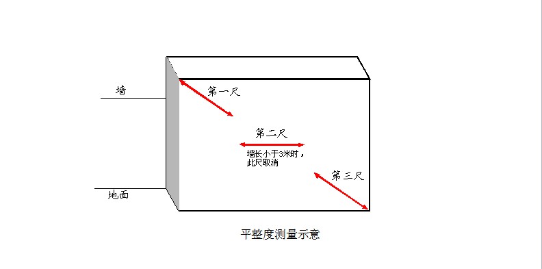 ●當(dāng)所選墻長度大于3米時(shí),除按45度角斜放靠尺測量兩次表面平整度外,還需在墻長度中間水平放靠尺測量1次表面平整度。跨洞口部位必測。這3個(gè)實(shí)測值分別作為判斷該指標(biāo)合格率的3個(gè)計(jì)算點(diǎn)。