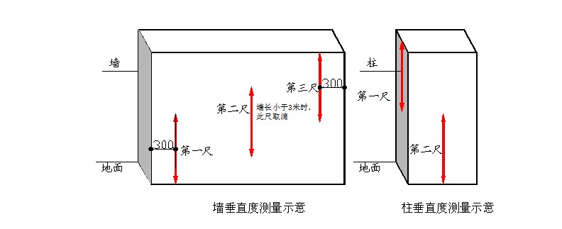 ●當(dāng)墻面長度大于3米時(shí),還需在墻長度中間位置增加1次水平測量,3次測量值均作為判斷該實(shí)測指標(biāo)合格率的3個(gè)計(jì)算點(diǎn)。