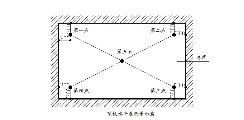 (1)指標(biāo)說明:考慮實(shí)際測量的可操作性,選取同一功能房間砼頂板內(nèi)四個(gè)角點(diǎn)和一個(gè)中點(diǎn)距離同一水平基準(zhǔn)線之間5個(gè)實(shí)測值的極差值,綜合反映同一房間砼頂板的平整程度。