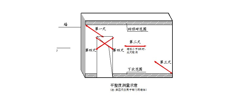 ●墻面有門窗、過道洞口的,在各洞口45度斜交測一次,作為新增實(shí)測指標(biāo)合格率的1個(gè)計(jì)算點(diǎn)。